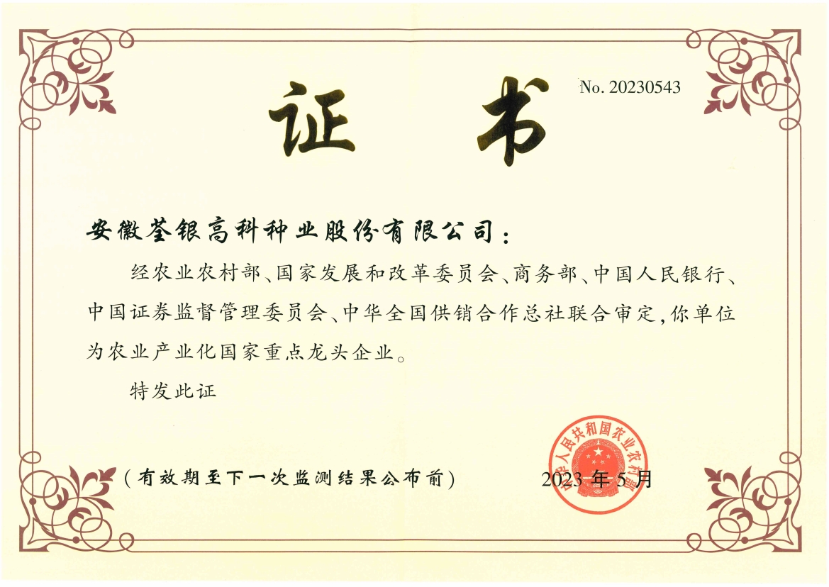 安徽荃銀高科種業(yè)股份有限公司是一家“以種業(yè)為核心、農(nóng)業(yè)服務(wù)為延伸、探索和創(chuàng)新農(nóng)業(yè)多元化發(fā)展”的現(xiàn)代高科技種業(yè)上市公司,證券代碼:300087。公司注冊(cè)資金9.47億元,系“中國(guó)種業(yè)領(lǐng)軍企業(yè)、農(nóng)業(yè)產(chǎn)業(yè)化國(guó)家重點(diǎn)龍頭企業(yè)、國(guó)家高新技術(shù)企業(yè)、農(nóng)業(yè)部首批農(nóng)作物種子育繁推一體化企業(yè)、中國(guó)種業(yè)信用明星企業(yè)"。在國(guó)內(nèi)控股子公司20多家,在國(guó)外設(shè)立分支機(jī)構(gòu)4家,良種銷售至全國(guó)20多個(gè)省(市、區(qū)),出口覆蓋20多個(gè)國(guó)家與地區(qū),種業(yè)綜合實(shí)力、雜交水稻研發(fā)、推廣及海外業(yè)務(wù)規(guī)模均居全國(guó)種子企業(yè)前2位。